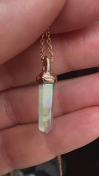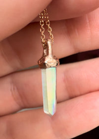 Angel Aura Quartz, also known as Aura Lite, is the name given to Quartz that undergoes extreme heat (1600*F),and then coated with a special blend of metals such as Platinum, Gold, and Silver. These minerals create the iridescent glow that Angel Aura Quartz displays, as well as enhancing the sheer power of this crystal.